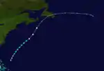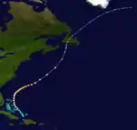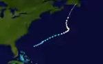 Around August 31, a low-pressure area formed along the tail end of a cold front extending from the Bahamas to Bermuda.[4] Early on the following day, a tropical depression developed roughly 510 mi (820 km) east-southeast of Jacksonville, Florida.[2] The depression moved slowly east-northeastward as the cold front dissipated.[4][2] Late on September 3, the system intensified into a tropical storm, and the next day the cyclone passed northwest of Bermuda.[2] Based on observations from the S.S. Evergreen City, the small storm likely reached Category 1 hurricane intensity early on September 5.[4] The cyclone continued to strengthen, reaching Category 2 intensity on September 6 while drifting northward and then peaking with maximum sustained winds of 105 mph (165 km/h) early the following day. On September 8, the system curved northwestward and weakened to a Category 1 hurricane. The storm then turned north-northeastward on September 9 and transitioned into an extratropical cyclone later that day. The extratropical low continued north-northeastward until dissipating over southern Newfoundland on September 10.[2] Cape Race observed sustained winds of 29 mph (47 km/h).[4]