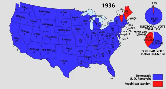 ![]() Presidential election results map. Blue denotes states won by Roosevelt/Garner, red denotes those won by Landon/Knox. Numbers indicate the number of electoral votes allotted to each state. | |||||||||||||||||||||||||||||