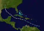 Around 00:00 UTC on August 10,[6] a rapidly-moving tropical storm was identified southeast of Barbados.[5] It tracked into the Caribbean Sea and intensified into the season's second hurricane, with the center of the storm narrowly missing Jamaica to the north late on August 11. Observations from Grand Cayman indicate that it strengthened into a Category 2 hurricane,[5] reaching peak winds of 100 mph (160 km/h) that day, before the system slowly weakened. It moved through the Yucatán Channel and into the Gulf of Mexico, making a later landfall just west of Cameron, Louisiana, at 01:00 UTC on August 15 with winds of 75 mph (121 km/h). The cyclone curved north-northeast and was last observed as a weak tropical depression along the Arkansas–Louisiana border at 12:00 UTC on August 15.[6]