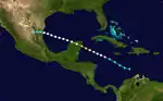 A tropical depression formed over the Gulf of Honduras around 18:00 UTC on October 10 and quickly intensified into a tropical storm six hours later.[6] The system moved northwest and struck San Pedro Town, Belize, with winds of 45 mph (72 km/h) at 08:00 UTC on October 11.[5] It weakened to a tropical depression while moving across the Yucatán Peninsula but regained tropical storm intensity and reached peak winds of 60 mph (97 km/h) after emerging into the Gulf of Mexico. The cyclone turned east toward the Florida Keys but began backtracking on October 15, embarking on a west-northwest trajectory that brought it ashore Galveston Island, Texas, around 13:00 UTC on October 17. It maintained winds of 45 mph (72 km/h) at the time. Once inland, the storm continued west-northwest and was last analyzed northwest of Houston at 18:00 UTC.[5][6]