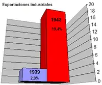 One of the direct consequences of the Second World War on the Argentine state of affairs was the economic boost that resulted from industrialization. In 1943, for the first time, the index of industrial production surpassed that of agricultural production.[9] Spearheaded by the textile industry, industrial exports increased from 2.9% of the total in 1939 to 19.4% in 1943.[10]