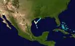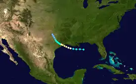 A circulation aloft was first documented across the western Gulf of Mexico on September 12. It became evident in surface maps three days later, marking the formation of a tropical storm by 18:00 UTC about 270 mi (435 km) southeast of Matamoros, Tamaulipas. The nascent cyclone tracked northwest and attained hurricane intensity on September 16 before reaching its peak as a Category 2 hurricane with winds of 100 mph (160 km/h) the following morning.[8] Thereafter, an area of high pressure over the northern High Plains forced the system to complete a counter-clockwise loop.[7] It turned northeast and steadily weakened before reaching the southern coastline of Louisiana as a tropical depression by 12:00 UTC on September 20.[8]