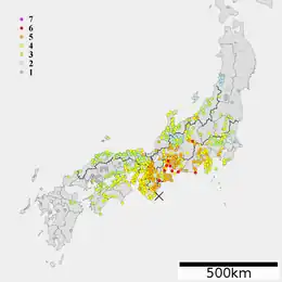 Felt intensities of greater than Shindo 5 were recorded along the southern coast of Honshū, with Shindo 3–4 in Tokyo.[6] The observed teleseismic response and tsunami records have been matched using a rupture area of 220 x 140 km and a maximum displacement of 2.3 m.[7] It has been suggested that splay faults, linking back into the plate interface, had an important role in generating large tsunamigenic earthquakes along the Nankai trough. The 1944 event could have occurred on such a splay fault.[8]