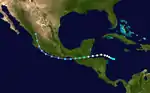 A tropical storm formed southeast of the Nicaragua–Honduras border early on August 29 and tracked northeast. After curving north and then west, the cyclone attained peak winds of 70 mph (110 km/h) over the Gulf of Honduras early on August 31. It moved ashore near Belize City, Belize at peak strength, where heavy rainfall and high tides resulted in flooding of 2–3 ft (0.61–0.91 m) within the city.[3] The system weakened quickly once inland, dissipating just northeast of Ocosingo, Chiapas by 18:00 UTC on September 1.[2]