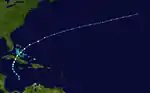 Another short-lived tropical storm was first identified about 195 mi (314 km) east of Guadeloupe by 12:00 UTC on September 9. Data from a reconnaissance aircraft indicated the storm intensified slightly to attain winds of 60 mph (97 km/h) by early the next day,[2] in spite of a poorly-defined circulation center.[3] It tracked northwest and then north, passing within 130 mi (210 km) of Bermuda before dissipating around 18:00 UTC on September 12.[2]