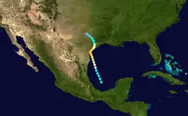 In late August, an area of disturbed weather persisted across the Bay of Campeche, eventually organizing into a tropical depression about 145 mi (233 km) northeast of Veracruz, Mexico by 00:00 UTC on August 24. The system gained steady strength on its north-northwest course, becoming a hurricane early the next day and attaining peak winds of 115 mph (185 km/h) – the first major hurricane of the season – southeast of Corpus Christi, Texas by 12:00 UTC on August 26.[2] At the time, the cyclone was thought to have possessed winds as strong as a 135 mph (217 km/h),[3] but this value was lowered in reanalysis. The hurricane made landfall along Matagorda Island, Texas at peak intensity by 12:00 UTC on August 27 and progressed inland, only slowly weakening to tropical storm intensity early the next morning. The cyclone curved northwest, ultimately dissipating southwest of the Dallas–Fort Worth metroplex around 18:00 UTC on August 29.[2]