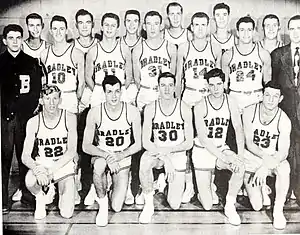 The 1949–50 Bradley Braves men's basketball team represented Bradley University in college basketball during the 1949–50 season. The team finished the season with a 32–5 record[1] and were national runners-up to the City College of New York (CCNY) in both the 1950 NCAA tournament and 1950 National Invitation Tournament. Early on in the NCAA Tournament's days, which began in 1939, teams were allowed to participate in both it and the NIT. The 1949–50 college basketball season is noteworthy in that it is the only year in which a team won both tournaments (CCNY), and the losing team of both championships happened to be Bradley.