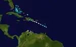 A tropical depression formed to the east of the Lesser Antilles on August 30. It moved steadily west-northwestward,[8] passing over Barbados as a weak tropical storm.[6] Seven people drowned on the island and 27 houses were destroyed in Bridgetown.[9] After entering the Caribbean Sea on September 1, hostile conditions weakened the storm, and the third tropical cyclone of the season degenerated into a tropical wave on September 3 to the south of the eastern tip of the Dominican Republic.[8]