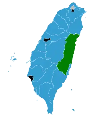 With a high turnout of 79.6%,[6] KMT-backed candidates were elected in 17 out of 21 cities/counties, CDSP took one and the remaining were captured by independents.