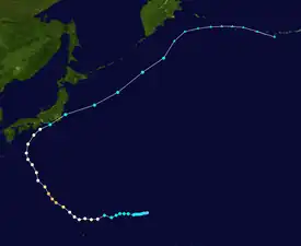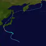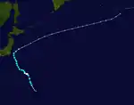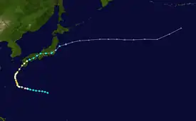 Typhoon Marie had a minimum pressure of 956 mb and a maximum windspeeds of 85 mph. Marie crossed the southern islands of Kyūshū and Shikoku before turning northeast and striking Hokkaidō island. Marie caused the ship Toya Maru to sink in the Tsugaru Strait. 1,361 people were killed and 400 were left missing.[4] Due to this disaster, the typhoon is known in Japan as the Toya Maru Typhoon.[5]