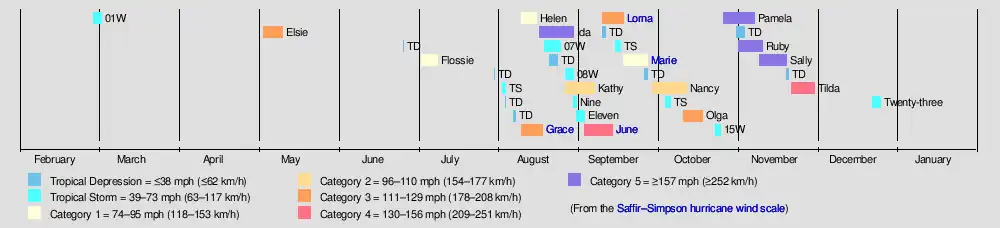 On October 27, Typhoon Pamela formed as a tropical depression. Pamela reached a peak of 900 mbar and 175 mph on November 1 and reached a secondary peak of 935 mbars on November 5. Gusts at landfall just to the west of Macau reached 175 km/h in Waglan Island and 155 km/h in Hong Kong Observatory which were the strongest since November 10, 1900 when the mean hourly wind speed reached 113 km/h (71 mph or 61 kts) at the Royal Observatory in Tsim Sha Tsui, in par with Typhoon Gloria. Pamela was one of three storms that reached Category 5 super typhoon status in the South China Sea, with others being Typhoon Rammasun of 2014 and Typhoon Rai of 2021.