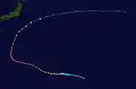 About two weeks after Tropical Storm 01W dissipated over the Philippines, a new tropical depression formed to the southeast of Guam on January 21. Gradual intensification took place as the depression tracked westward.[4] The JTWC began monitoring the system as Tropical Storm Rose the following day,[2] with the first advisory on the storm placing maximum winds at 50 mph (80 km/h). Rose maintained this intensity for roughly 24 hours before undergoing a brief period of rapid intensification, attaining winds of 110 mph (180 km/h) early on January 23. For most of the day, the now Category 2 typhoon, strengthened at a more modest rate before undergoing a second brief period of rapid intensification. At the end of the second strengthening phase, Rose had attained its peak intensity just below Category 5 status, on the modern-day Saffir–Simpson Hurricane Scale, with winds of 155 mph (249 km/h),[5] and a minimum pressure of 952 millibars (28.1 inHg).[4] Upon attaining this intensity, Rose became the most intense January typhoon on record, surpassing that of Super Typhoon Karen in 1948.[5][6]