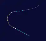 The first tropical cyclone of the 1957 season, classified as Tropical Storm 01W by the JTWC,[2] was initially identified early on January 3 as a tropical depression over open waters east of the Philippines.[3][4] Within several hours, the system intensified into a tropical storm as it tracked west-northwestward. Later that day, the storm attained its peak intensity with winds of 45 mph (72 km/h)[3] and a barometric pressure of 995 millibars (29.4 inHg).[4] Tropical Storm 01W maintained this intensity through January 5 before abruptly weakening to a tropical depression near the eastern Philippines. The system made landfall in eastern Leyte early on January 6 with winds of 35 mph (56 km/h) before dissipating the following day over Romblon.[3][4]