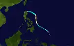 Shirley formed on April 11 east of the Philippines. It moved north and intensified to its brief peak of 115 mph (185 km/h) winds and a pressure of 975 mbar on April 15. Shirley then turned to the northwest and weakened to a tropical storm on April 16. Shirley turned to the west and dissipated on April 18 near the northern end of Luzon.