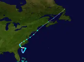 On September 6, a broad low pressure area developed between the Bahamas and Bermuda. The system moved northward, organizing into a tropical storm on September 9. The system had a large wind field, and was likely a subtropical cyclone. Moving northwestward at first, the storm turned to the northeast ahead of a cold front, with sustained winds of around 45 mph (72 km/h). Nantucket island in Massachusetts reported sustained winds of 39 mph (63 km/h) during the storm's passage. On September 11, the storm interacted with the cold front, becoming an extratropical storm, which lasted until September 14. The storm was added to the Atlantic hurricane database in 2016.[26]