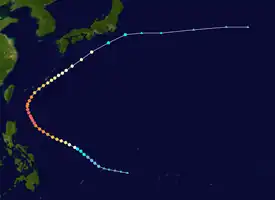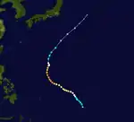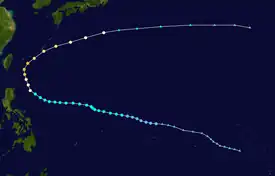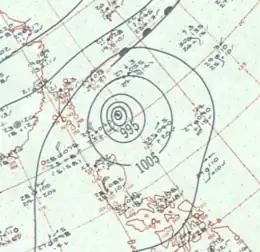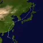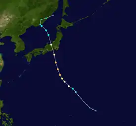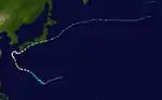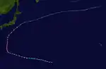 On August 1, a well-developed low pressure area and easterly wave accompanying the area was detected northwest of Guam. Following the discovery of an eye in the system, the area was designated as Tropical Depression Ellen by the JTWC at 06:00 UTC of August 2.[2] Ellen intensified into a tropical storm four hours later, before consolidating further into a typhoon 24 hours after. On August 4, as Ellen moved northwestward, the storm reached its peak intensity while located 320 km (200 mi) south-southeast of Okinawa, attaining winds of 185 km/h (115 mph).[17] Taking an erratic path, Ellen proceeded to decelerate off the coast of Kyushu. A strong ridge to the north prevented Ellen from further movement for approximately 46 hours. During that time, a recon aircraft measured the very large eye at 160 km (100 mi). The ridge then weakened, allowing the typhoon to accelerate in an east-northeast direction.[2] By August 8, Ellen had weakened into a tropical storm. Ellen moved along the south coast of Japan, passing directly above its capital city Tokyo. The storm entered the open sea east of Honshu on August 9, before transitioning into an extratropical cyclone.[17]