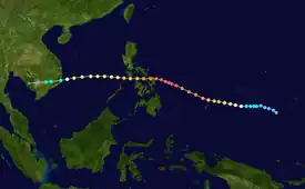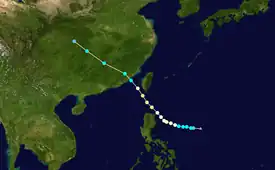 A tropical disturbance in the Philippine Sea was first indicated on August 13, taking a slight dip south on August 15, before generally going in a west direction. The system made its first landfall over Luzon at 12:00 UTC of August 17, before intensifying into a tropical depression that day. The depression continued its journey westward before reaching inland at Hainan on August 19, prior to weakening back into a tropical disturbance. The system entered the Beibu Gulf and made its final landfall over northern Vietnam, and dissipated on August 20.[23]