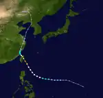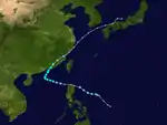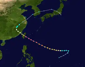 An area of disturbed weather between Yap and Koror organized into a tropical depression on July 12.[2] Moving to the northwest, it quickly strengthened, reaching tropical storm status, after an eye was found by a recon aircraft.[10] On July 13, Billie intensified into a typhoon, before gradually strengthening further. After peaking at 105 mph (169 km/h) that day, Billie crossed over northeastern Taiwan, quickly weakened, and made landfall on eastern China on July 15.[11] A weak trough brought the storm northeastward, where after weakening to a tropical storm, it traversed the Yellow Sea and crossed the Korean Peninsula,[2] losing tropical characteristics on July 18.[10]