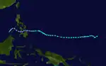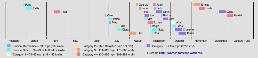The 1959 Pacific typhoon season featured 24 tropical cyclones, though operationally 59 total areas of investigation were classified by the Joint Typhoon Warning Center (JTWC);[2] three systems were handled by the responsibility of FWC at Pearl Harbor and the USWB at Honolulu. Three systems were questionable due to lack of reconnaissance aircraft use. In total, the season featured 65 tropical cyclones and areas of investigation operationally, including central Pacific Hurricane Patsy, which was operationally believed to have crossed the International Date Line into the western Pacific. The first annual tropical cyclone report for the western North Pacific Ocean was issued by the agency.[2]