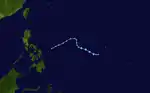 Tilda attained its peak intensity of 145 mph (233 km/h) 400 miles (640 km) west of Guam on April 19, and it slowly weakened as it turned north-northeast and decreased in forward speed.[6] The typhoon became quasi-stationary for 30 hours on April 20, weakening to a minimal typhoon in the process by the next day. After drifting under weak steering currents, Tilda accelerated to the north-northeast on April 22 and weakened to a tropical storm. Tilda dissipated on April 23 as it merged with the upper-level westerlies 130 miles (210 km) southwest of Iwo Jima, and overall stayed in the open ocean, causing no casualties.[2]