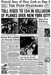 On December 16, 1960, a United Airlines Douglas DC-8 bound for Idlewild Airport (now John F. Kennedy International Airport) in New York City collided in midair with a TWA Lockheed L-1049 Super Constellation descending toward LaGuardia Airport.[1] The Constellation crashed on Miller Field in Staten Island and the DC-8 in Park Slope, Brooklyn, killing all 128 aboard the two aircraft and six people on the ground. The accident was the world's deadliest aviation disaster at the time, and remains the deadliest accident in the history of United Airlines.