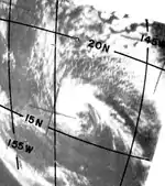 On August 24, satellite imagery indicated a hurricane with a defined eye was located over the central Pacific Ocean. It slowly weakened as it moved over lukewarm waters, and deteriorated more rapidly after wind shear increased. By August 28, the system consisted of a circulation with only weak associated convection. It weakened to a tropical depression on August 30, although it remained a tropical cyclone until September 2. At that time it was last observed about 200 mi (320 km) south of Hilo, Hawaii.[4][3]