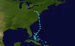 Toward the end of May, a tropical disturbance moved northward from Panama toward the western Caribbean Sea. On May 31, a trough moved across eastern Cuba.[7]: 266 On June 1, a tropical depression developed over the western Bahamas.[2] Initially, the depression could have been a subtropical cyclone, due to an upper-level low located over the circulation.[7]: 277 The depression moved to the northeast and later to the north, strengthening into a tropical storm on June 2. A day later, the storm attained peak winds of 60 mph (95 km/h); on the same day, the storm made landfall just west of Cape Hatteras, North Carolina. By June 4, the storm weakened to a tropical depression as it continued northwestward through Virginia, Maryland, and finally Pennsylvania,[2] where the depression degenerated into a trough.[7]: 270