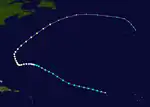 By late on September 12, the storm curved northeastward and passed to the northeast of Bermuda early the next day,[3] bringing 4.05 in (103 mm) of precipitation and wind gusts up to 70 mph (110 km/h).[29][30] Throughout the island, low-lying areas were flooded and trees were felled. At St. George's Island, residents were briefly left without electricity and telephones and the causeway linking St. George's Island to the main island was inundated.[31] Early on September 13, Ethel intensified into a Category 2 hurricane and soon peaked with winds of 105 mph (169 km/h). The system became extratropical late on September 14, while located about 255 mi (410 km) southeast of Cape Race. Newfoundland. The extratropical remnants slowly weakened while meandering around the Atlantic, until dissipating just north of the Azores on September 17.[3]