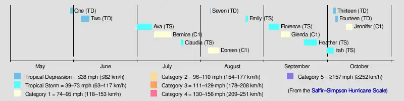 Notable storms included Tropical Storm Emily and Hurricane Jennifer. The precursor disturbance of Emily killed nine people in Mexico and left 100,000 homeless. Hurricane Jennifer was the only landfalling named storm of the season, causing one death. In this season, only three storms (Ava, Bernice, and Florence) were operationally categorized as tropical depressions at the first advisory. All other storms were operationally upgraded directly to storm strength, bypassing the depression stage.[1]