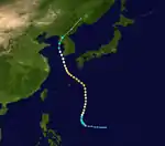 Typhoon Billie formed in the Philippine Sea as a weak depression. It intensified while heading northwards, becoming a tropical storm on the 23rd, a typhoon on the 25th, and reaching its maximum intensity of 110-knot winds and a 945-millibar central pressure as it passed the Ryukyu Islands on the 27th. The storm brushed South Korea as a category-1-equivalent typhoon on the 29th before making landfall in North Korea on the 30th.[2] The remnants of Billie dissipated over the Sino-Soviet border shortly after.