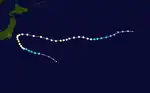 In mid-June a change in the jet stream over a large part of the Pacific Ocean caused an increase in tropical wave frequency; one becoming the precursor to Olga. The wave was first noticed near the Marshall Islands, particularly the Island of Majuro on June 24. As it moved west weather satellites depicted the wave had begun to organize with considerable convection and spiraling storm bands as it neared the Central Caroline Islands. Due to the waves close proximity to a high pressure area to the north, strong easterlies accelerated it to the west. The increased forward speed inhibited the establishment of a circulation until it was south of Guam early on June 29. Later that day reconnaissance found a closed center and gale-force winds, prompting the JTWC to upgrade the low into a tropical storm and was given the name Olga. As it entered the Philippine Sea the ridge that had kept it to the south began to weaken allowing Olga to move in a northwestward direction. As Olga entered an increasingly favorable environment, the storm slowed its forward speed and strengthened into a typhoon late on June 29. Rapid intensification followed as the system bottomed out at a pressure of 904 hPa (26.7 inHg) and winds of 160 mph (260 km/h) on July 1.[3] The rapid 62 millibar drop between June 30 and July 1 caused an intense wind profile surrounding the small eye. The storm followed a break in the ridge and moved north while gradually weakening. As Olga was passing to the east of Taiwan a short wave from the China mainland gave an eastward component to the storm's motion. A low developed following the short wave and began to influence Olga, causing the typhoon to weaken. Dry air soon entered the circulation, reducing the systems overall convection. During July 5 Olga made landfall on the Kansai region of Japan, south of Osaka, as a tropical storm. The system continued into the Sea of Japan, and merged with a cold front. The remaining low tracked over South Korea before completely dissipating on July 7.[2]