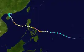 Tropical Storm Violet formed east of the Philippines, then traveled westward, becoming a tropical storm before making landfall on Luzon. Violet then crossed the South China Sea before making landfall in China as a weak tropical storm. It dissipated over China shortly after.