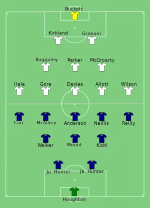 England's defensive midfielder was 17-year-old Janet Bagguley of Macclesfield Ladies, described by Wendy Owen as "hard as nails and a ferocious tackler".[9] Team captain Sheila Parker (née Porter) was a 24-year-old centre half.
