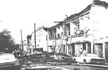 When the storm reached central Xenia at 4:40 pm, apartment buildings, homes, businesses, churches, and schools including Xenia High School were destroyed. Students in the school, practicing for a play, took cover in the main hallway seconds before the tornado dropped a school bus onto the stage where they had been practicing and extensively damaged the school building.[8][23] Several railroad cars were lifted and blown over as the tornado passed over a moving Penn Central freight train in the center of town.[24] It toppled headstones in Cherry Grove Cemetery, then moved through the length of the downtown business district, passing west of the courthouse (which sustained some exterior damage). Numerous businesses in downtown Xenia were heavily damaged or destroyed, and several people were killed at the A&W Root Beer stand as the building was flattened. Upon exiting Xenia, the tornado passed through Wilberforce, heavily damaging several campus and residential buildings of Wilberforce University.[24] Central State University also sustained considerable damage, and a water tower there was toppled. Afterwards, the tornado weakened before dissipating in Clark County near South Vienna, traveling a little over 30 miles (48 km).