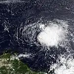 In Dominica, strong winds damaged or destroyed 80% of homes, leaving 75% of the island's population homeless. Agricultural was also severely impacted, with 75% of crops ruined, including a complete loss of bananas.[24] There were 56 deaths and 180 injuries.[7][24] Similar destruction occurred on Guadeloupe and Martinique, with hundreds left homeless and extensive damage to crops. Guadeloupe and Martinique also had $50 million and $100 million in damage, respectively. In Puerto Rico, flooding and high winds combined resulted in $70 million in damage and seven fatalities, four from electrocution.[24] Dominican Republic was lashed with very strong winds and torrential rains.[7][24] Entire villages were destroyed and numerous others were left isolated because of damage or destruction to many roads.[25] Thousands of houses were destroyed, leaving over 200,000 homeless in the aftermath of the hurricane.[7] Additionally, nearly 70% of the country's crops were ruined.[25] Overall, the storm caused at least 2,000 deaths and about $1 billion in damage in Dominican Republic. Minimal impact occurred in the Bahamas, Cuba, and Haiti.[7] In Florida, strong winds left moderate damage, including a downed radio tower, snapping a crane, and deroofing buildings.[26] There were also 10 tornadoes.[27] Damage totaled approximately $95 million.[26] Other states along the East Coast of the United States experienced flooding and tornadoes. The latter was particularly severe in Virginia, with tornadoes causing one death, damaging 270 homes, and destroying three other homes.[28] Throughout the United States, there were 15 deaths and about $320 million in damage.[7]