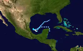 A tropical disturbance formed over the Isthmus of Tehuantepec on August 24.[29] By the following day, the disturbance developed into a tropical depression,[3] operationally classified as the eight of the season. The depression entered the Bay of Campeche on August 25 and headed northward.[29] Around 06:00 UTC the following day, the system peaked with maximum sustained winds of 35 mph (55 km/h).[3] However, on August 28, a ridge of high pressure forced the system to move west-southwestward,[29] causing it make landfall in a rural area of Tamaulipas later that day.[3] The depression brought heavy rainfall to some areas of Mexico, with 18.94 in (481 mm) of precipitation observed in Santa María Xadani, Oaxaca. Rainfall extended northward into Texas, peaking at 4.86 in (123 mm) in McAllen.[29]