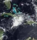 Around midday on September 4, Frederic made landfall in Humacao, Puerto Rico with winds of 50 mph (85 km/h).[3] Flooding on the island forced over 6,000 people to flee their homes in search of shelter. Numerous roads were closed due to landslides and inundation. At least nine cities experienced flooding.[30] After crossing Puerto Rico, Frederic briefly re-emerged into the Caribbean Sea, before making landfall near Santo Domingo, Dominican Republic with winds of 45 mph (75 km/h) at 00:00 UTC on September 6.[3] Minimal impact was reported in that country, though heavy rainfall, exceeding 24 in (610 mm) in some places, compounded damage inflicted by Hurricane David.[7] Frederic weakened further while crossing Hispaniola. Later on September 6, the system briefly re-emerged into the Atlantic Ocean, but land interaction with the island weakened it to a tropical depression. The storm crossed the Windward Passage and then made landfall in southeastern Guantánamo Province of Cuba early on September 7.[3] Due to the weak nature of Frederic, minimal impact was reported.[7] It then moved along, or just offshore the southern coast of Cuba. While situated south of Matanzas Province early on September 9, the system re-strengthened into a tropical storm. Despite land interaction with Cuba, Frederic continued to intensify.[3]