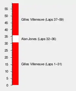 Villeneuve coasted home, allowing Elio de Angelis and Hans-Joachim Stuck to unlap themselves, but finishing with a 48-second margin over Arnoux. Later, Villeneuve revealed that he had been nursing the car with failing oil pressure for the final 25 laps. The American Shadow team celebrated de Angelis' fourth place, his only points of the year. The win by Villeneuve was his third, matching champion Scheckter's total, securing a one-two finish in the Drivers' Championship.
