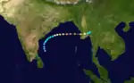On April 30 the monsoon trough spawned a tropical depression in the western Bay of Bengal. It tracked northeastward, becoming a tropical storm on the 1st and a cyclone on the 2nd. Its movement became more to the east, and the cyclone continued to quickly intensify, reaching a peak of 145 mph winds just before landfall. The small and compact cyclone hit southern Myanmar on the 4th, and it dissipated the next day over land. Moderate to heavy damage was experienced, but advance warning kept the death toll at only five.