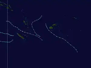 During February 7, Cyclone Harvey moved into the basin from the Australian region as a category 2 tropical cyclone with 10-minute windspeeds of 100 km/h (60 mph).[2][3] During the next day, Harvey gradually weakened as it moved towards the southeast, before at 1800 UTC the JTWC and TCWC Nadi reported that Harvey had weakened below tropical cyclone intensity.[3][4] The subsequent remnant low continued to move towards the south-southeast before it was last noted by the FMS on February 10, while it was located about 270 km (170 mi) to the east of New Caledonia.[2]