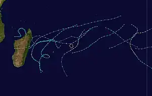 During the season, advisories were issued by Météo-France's (MFR) meteorological office at Réunion. At the time, the MFR area of warning responsibility was from the coast of Africa to 80° E, and the agency primarily used the Dvorak technique to estimate the intensities of tropical cyclones.[1] The Joint Typhoon Warning Center (JTWC), which is a joint United States Navy – United States Air Force task force that issues tropical cyclone warnings for the region,[2] also tracked a long-lived tropical storm in November in addition to the 8 storms MFR named,[3][4][5][6][7][8][9][10][11] which is comparable to the average of nine named storms per year.[12] Following the season, the boundary for the basin was extended to 90° E.[13]