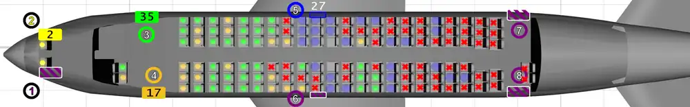 Colours in seats represent the exit taken by survivors assigned to those seats. (Red crosses show fatalities.)