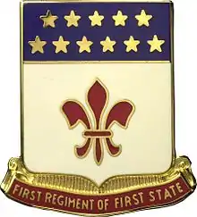 That for the regiments and separate battalion of the Delaware National Guard: On a wreath of the colors, Argent and Gules, a griffin's head erased Azure eared and beaked Or, langued Gules, collared Sable, fimbriated Argent and thereon three plates. Motto FIRST REGIMENT OF FIRST STATE