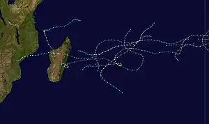 In addition to the named storms, the MFR tracked 11 tropical depressions or disturbances that did not intensify into a tropical storm. The agency did not issue any bulletins on eight of them. Of the remaining three, two formed in late December, and the other formed in mid-February. Tropical Depression B2, the longest lasting of the depressions, formed after a month of activity. An area of convection developed in the Mozambique Channel, and the MFR believed it to be connected to the depression that formed on December 28 east of Madagascar. With a ridge to the east, the system tracked southward, but failed to intensify due to strong wind shear. While passing west of Réunion, the depression dropped heavy rainfall, totaling 350 mm (14 in) along the northern coast and about twice that amount in the mountainous interior. On December 31, the depression dissipated to the southwest of Réunion.[1] On February 10, the JTWC tracked Tropical Cyclone 12S into the basin as a weakening tropical depression, which quickly dissipated.[3][5] A few days later, the JTWC also tracked Tropical Cyclone 15S from February 14–17, which briefly intensified into a minimal tropical storm in the eastern portion of the basin.[3][6]