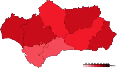 Despite opinion polls predicting a likely PSOE defeat, the election result was a major upset: the PSOE gained over 500,000 votes and 7 seats compared to the previous election and won a resounding victory as the PP stagnated and the IU vote collapsed. At 77.9%, turnout was the highest ever registered for a regional election in Andalusia.[3][4][5] This result allowed Chaves to form a coalition government with the Andalusian Party (PA), ending the period of political turmoil that had dominated the previous legislature.[6][7]