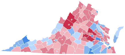 Virginia was also the only state Bill Clinton lost twice but Hillary Clinton won, as she managed a 5 percentage point victory in the state in 2016. As of the 2020 presidential election, this was also the last time Bath, Allegheny, Giles, Smyth, Tazewell, Lee, Wise, Dinwiddie, Accomack Counties, and the independent cities of Galax and Buena Vista voted for a Democratic presidential candidate.[2] The election was, however, the first time the Democratic Presidential nominee had carried Prince Edward County – famous for its Civil Rights-era school desegregation cases – since Harry S. Truman in 1948,[lower-alpha 1] and the first time since 1968 that Essex County had voted Democratic.[3]