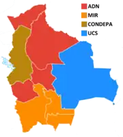 General elections were held in Bolivia on 1 June 1997.[1] As no candidate for the presidency received over 50% of the vote, the National Congress was required to elect a president on 4 August. Hugo Banzer of Nationalist Democratic Action (ADN) was subsequently elected. Whilst the ADN emerged as the largest party in Congress, it failed to win a majority of seats, and formed a coalition government with the Revolutionary Left Movement, Conscience of Fatherland and the Solidarity Civic Unity.[2]