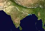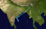 On May 13, a near-equatorial trough developed. The poorly organized system slowly tracked towards the north-northwest. The following day, deep convection consolidated around the center of circulation and the Joint Typhoon Warning Center (JTWC) classified the system as Tropical Cyclone 01B. Favorable upper-level conditions and good outflow allowed the storm to intensify. Shortly after, the cyclone attained tropical storm-force winds and turned towards the northeast. While gradually increasing in forward motion, the storm continued to strengthen. On May 17, the cyclone attained winds of 120 km/h (75 km/h), equivalent to a Category 1 hurricane on the Saffir–Simpson scale. By May 18 an eye developed and the storm reached its peak intensity with winds of 215 km/h (135 mph) before making landfall near Chittagong. After landfall, the storm rapidly tracked northeastward inland and dissipated early on May 20.[1] It caused significant damage and 67 fatalities.[2]