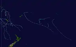 The following weak tropical disturbances were also monitored by the FMS, however all of these systems were either short lived or did not develop significantly. The first, Tropical Disturbance 01F, developed about 540 km (340 mi) to the northwest of Apia in American Samoa, however the system remained weak and was last noted later that day.[14] On December 25, Tropical Disturbance 04F developed over the Coral Sea within an area of strong vertical windshear in the Australian region.[15] During that day 04F moved towards the southeast and entered the South Pacific basin, before dissipating during December 26.[15] Tropical Depression 05F then developed on January 1 to the north of the Southern Cook Islands, while showing some baroclinic characteristics, before developing a fair amount of convection around the centre.[15] Convection surrounding the system decreased during January 3, before the system had become unclassifiable by January 5.[15] Tropical Disturbance 06F formed on January 3, to the southwest of French Polynesia, in an area of strong vertical windshear. Over the next couple of days the disturbance moved towards the southwest and never showed any signs of organising significantly.[15] Tropical Low/Disturbance 08F developed on January 16, within an active convergence zone, that was located to the east of Fiji.[15] Over the next couple of days convection around the centre increased slightly but vertical windshear restrained 08F from developing significantly, before on January 19 it moved into much cooler waters and stronger vertical windshear which ultimately led its demise.[15] Along with Cyclone Dani, 08F extended a trough of low pressure on to Fiji which caused significant flooding, 6 deaths and about 4 million (1999 FJD) worth of damage.[2][15]