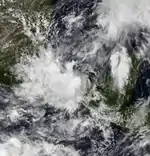 Interaction between a strong monsoon-type flow and a tropical wave in the Bay of Campeche resulted in the development of Tropical Depression Seven on September 5. By 00:00 UTC on September 6, the depression attained maximum sustained winds of 35 mph (56 km/h) and a minimum barometric pressure of 1,006 mbar (29.7 inHg).[13] Shortly thereafter, the center of circulation of the depression became difficult to locate, but was likely heading north-northwestward. Due to warm ocean temperatures, the SHIPS model predicted further intensification, despite the storm having almost no deep convection and being close to land.[58]